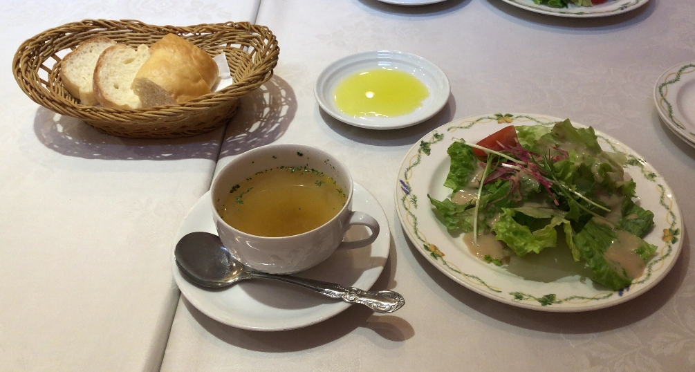 前菜のサラダとスープ。